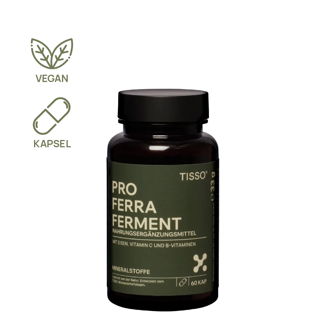Voor een gedoseerde aanvulling van de ijzervoorraad: Pro Ferra Ferment levert gefermenteerd ijzersulfaat van de koji-schimmel Aspergillus oryzae en combineert zo de goede verdraagbaarheid van ijzer op plantaardige basis met de hoge biologische beschikbaarheid van een bivalent ijzerzout. Het ondersteunt ook het ijzermetabolisme met vitamine C en geselecteerde B-vitaminen.