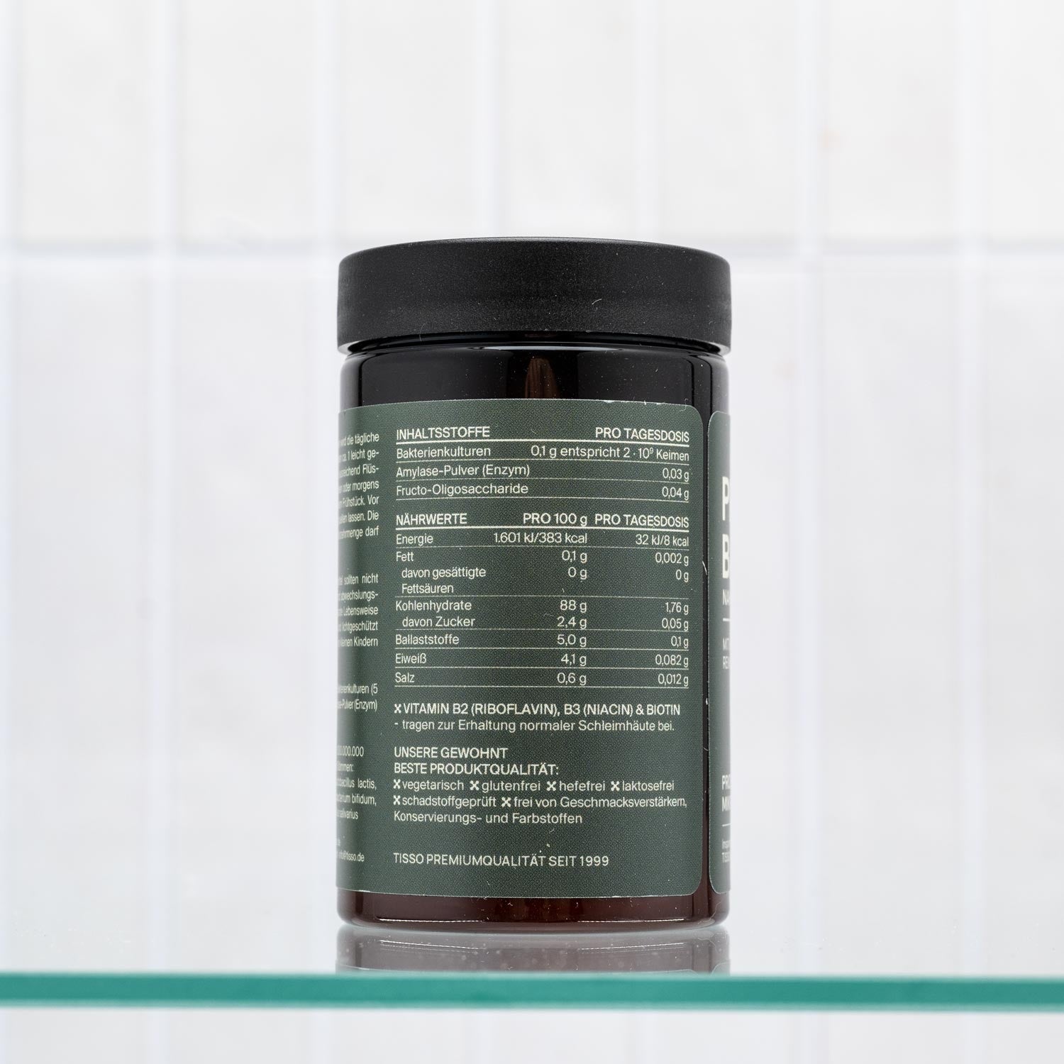De gevriesdroogde bacteriën bevinden zich in een beschermende matrix van rijstzetmeel en maltodextrine, waardoor ze bijzonder stabiel en houdbaar zijn totdat ze worden gerehydrateerd.