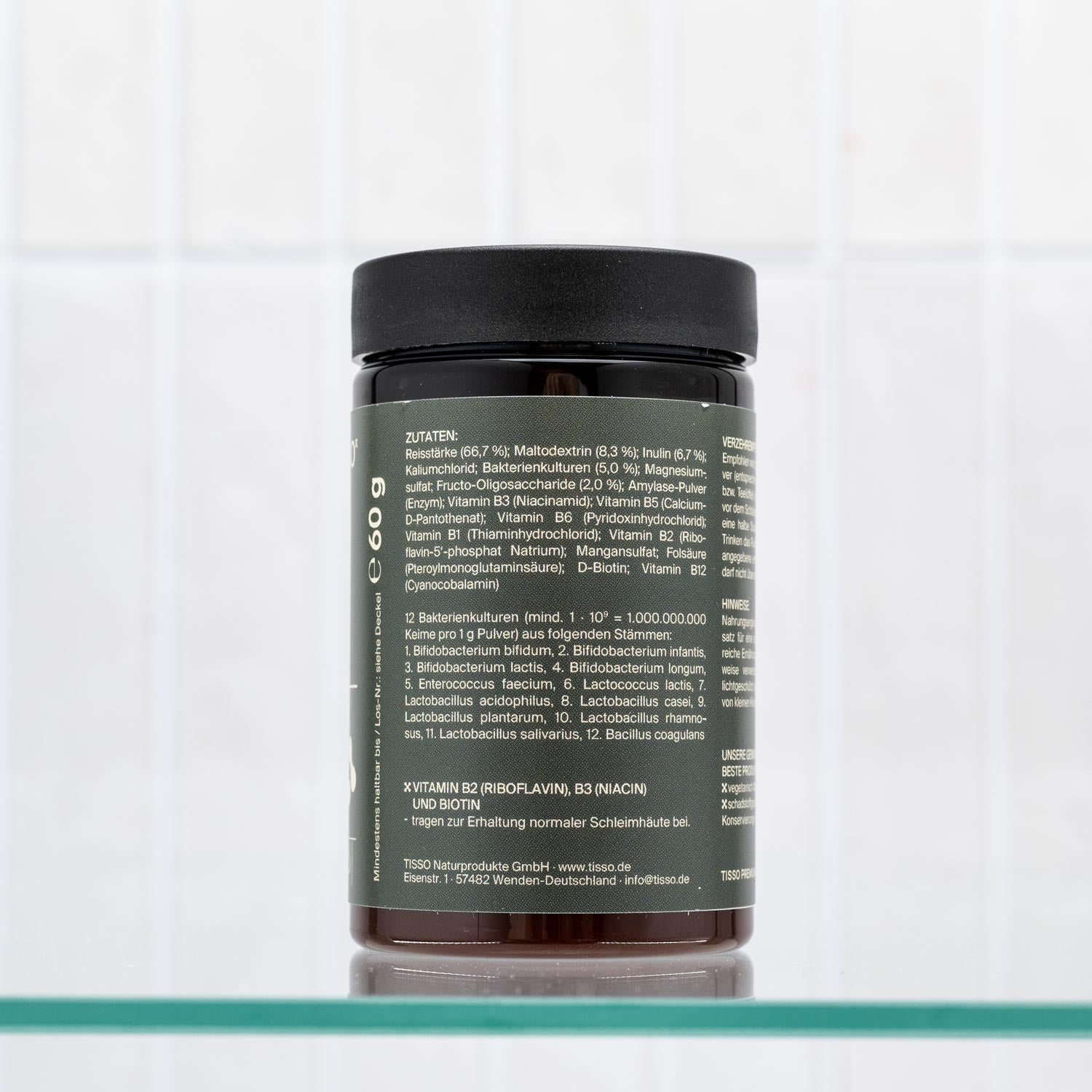 12 bacterieculturen (min. 1 - 109 = 1.000.000.000 kiemen per 1 g poeder) van de volgende stammen: