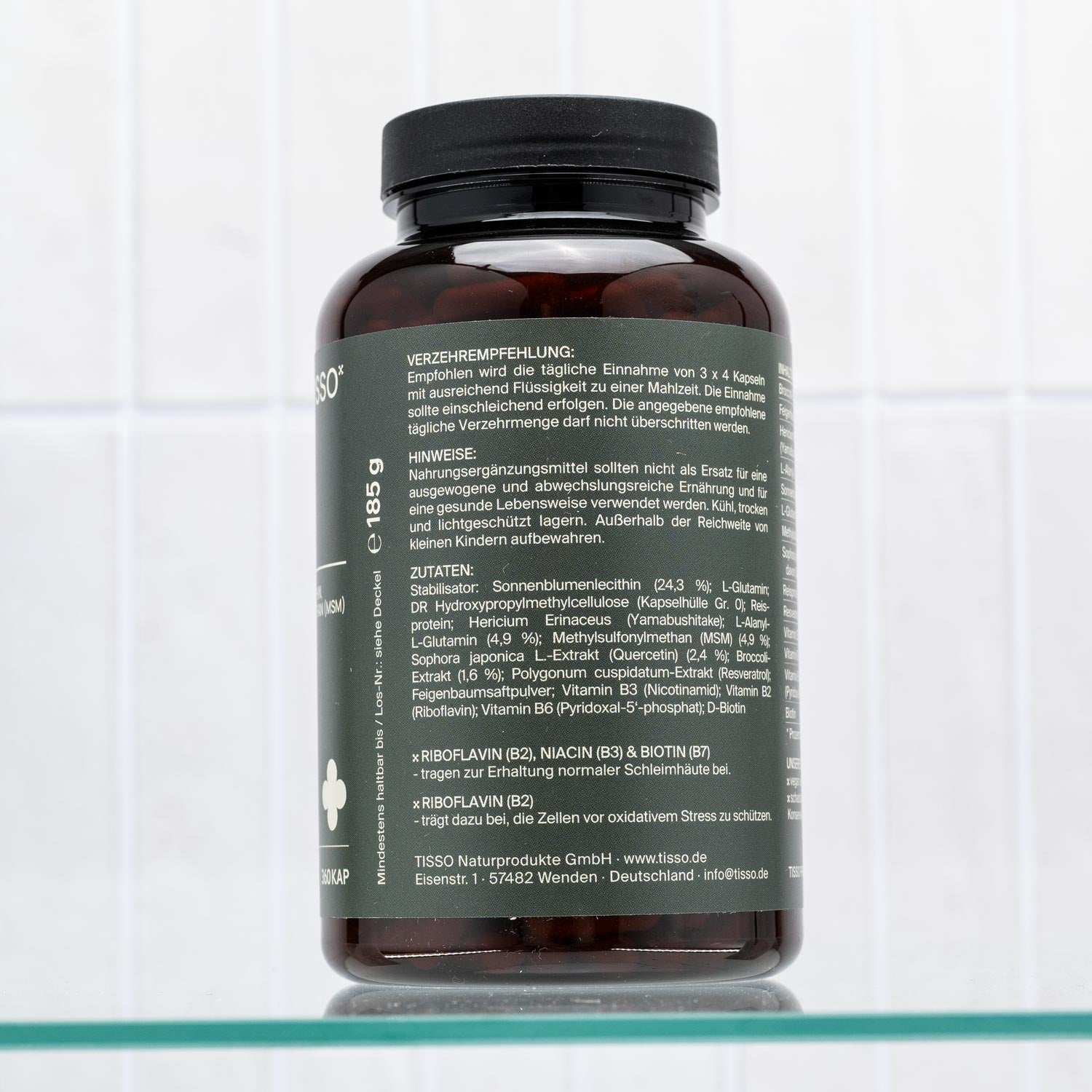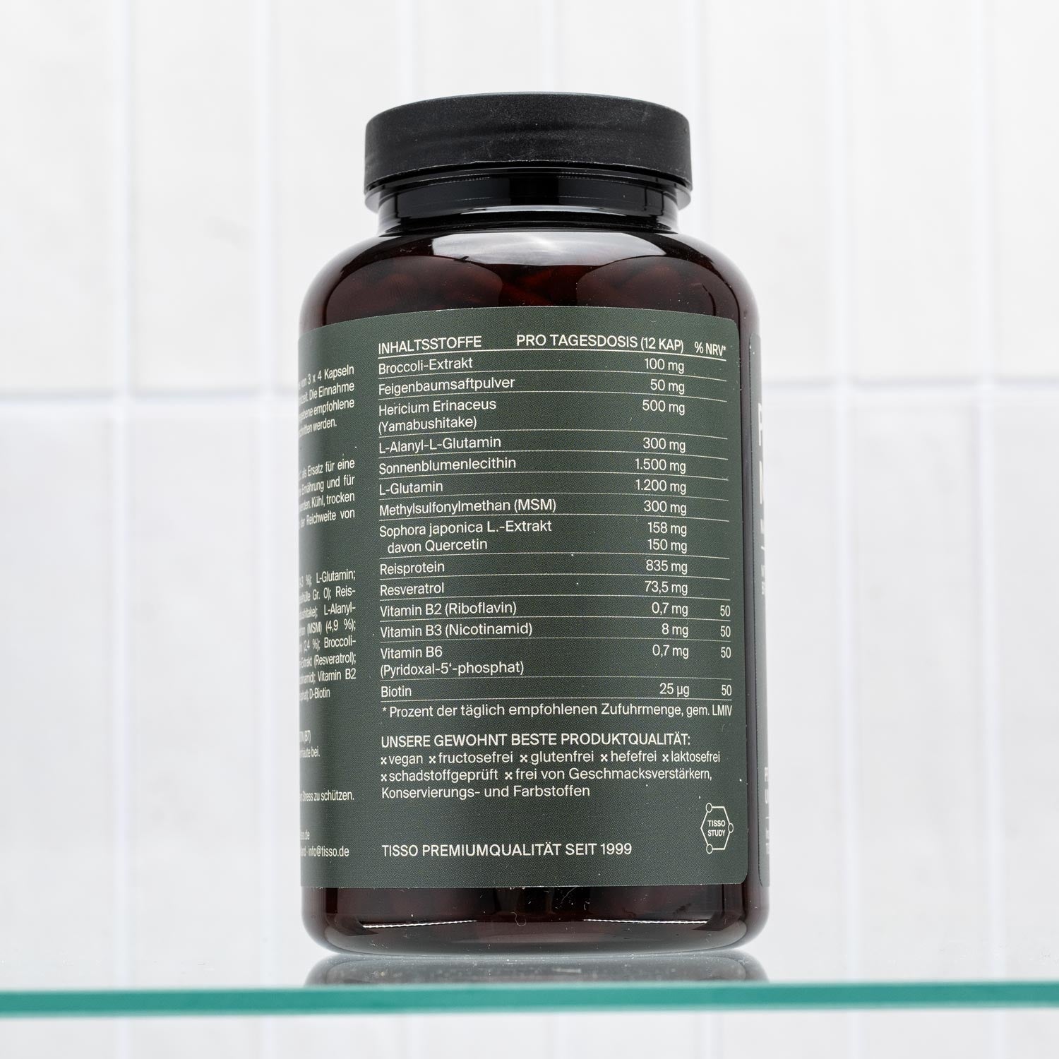 Veganistische glutamine en lecithine plus geselecteerde plantenextracten en B-vitaminen incl. MSM, quercetine, resveratrol, broccoli en Hericium erinaceus.