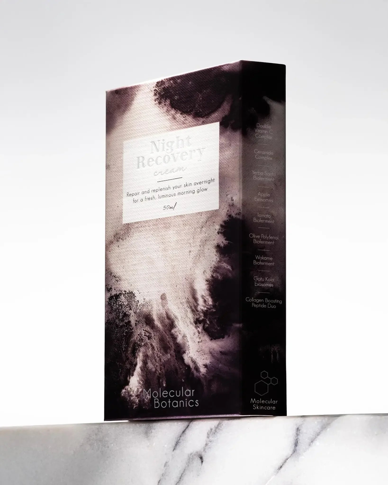 Yerba Santa en Tomaat Biofermenten leveren natuurlijke glycoproteïnen en aminozuren die de huid's eigen vochtfactor (NMF) aanvullen, terwijl Probiotische Exosomen de huid kalmeren en de microbioom versterken. Het Resurrection Plant Molecuul beschermt celmembranen tegen uitdroging en herstart vertraagde celfuncties voor een complete nachtelijke heropleving.